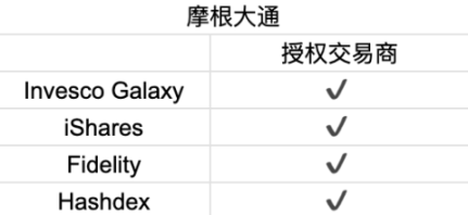摩根大通证券(JP Morgan Securities LLC)是景顺 /Galaxy、贝莱德、富达、Hashdex 这 4 家机构比特币现货 ETF 的授权交易商。