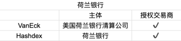 荷兰银行(ABN AMRO Bank)是 Hashdex ETF 授权交易商;美国荷兰银行清算公司(ABN AMRO Clearing USA LLC)则是 VanEck ETF 授权交易商。