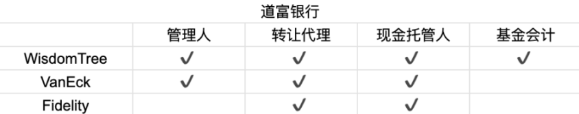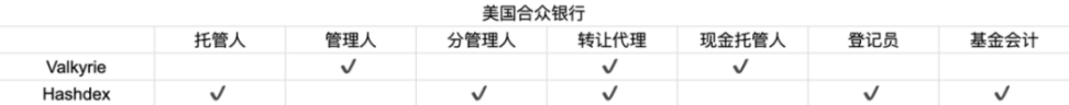 U.S. Bancorp Fund Services, LLC、U.S. Bank N. A. 以及 U.S. Bank Global Fund Services 三个实体参与了 Valkyrie、Hashdex 两家 ETF。U.S. Bank, N.A. 是 Hashdex ETF 的托管人,旗下 U.S. Bank Global Fund Services 则是 Hashdex ETF 的登记员、转让代理、分管理人与基金会计。U.S. Bank, N.A. 是 Valkyrie ETF 现金托管人,U.S. Bancorp Fund Services, LLC 则是 Valkyrie ETF 的管理人与转让代理。