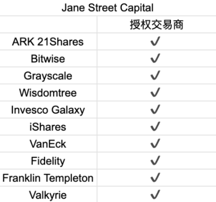 简街资本(Jane Street Capital)是 10 个比特币现货 ETF 的授权交易商,包括 ARK 21Shares、Bitwise、灰度、WisdomTree、景顺 /Galaxy、贝莱德、VanEck、富达、富兰克林邓普顿、Valkyrie。