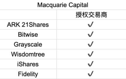 据 11 份 ETF 文件显示,Macquarie Capital (USA) Inc. 是 6 个比特币现货 ETF 的授权交易商,包括 ARK 21Shares、Bitwise、灰度、WisdomTree、贝莱德、富达。