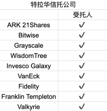 11 个比特币现货 ETF 中,9 个 ETF 选择特拉华信托公司作为受托人,包括 ARK 21Shares、Bitwise、灰度、Wisdomtree、景顺 /Galaxy、VanEck、富达、富兰克林邓普顿与 Valkyrie。