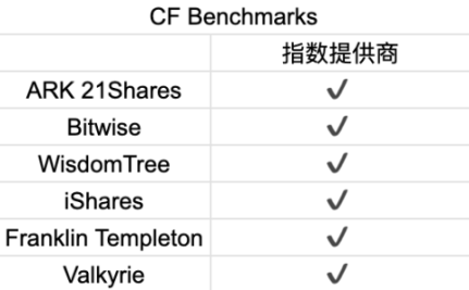 目前,CF Benchmarks 担任 6 个比特币现货 ETF 的指数提供商,分别为 ARK 21Shares、Bitwise、WisdomTree、贝莱德、富兰克林邓普顿、Valkyrie。