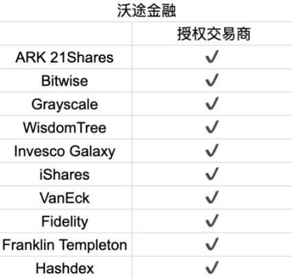 沃途金融(Virtu Americas LLC)是 10 个比特币现货 ETF 的授权交易商,包括 ARK 21Shares、Bitwise、灰度、WisdomTree、景顺 /Galaxy、贝莱德、VanEck、富达、富兰克林邓普顿、Hashdex。