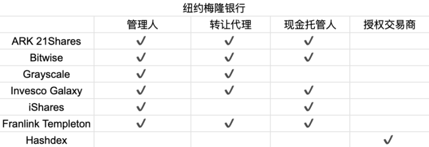 在本次比特币现货 ETF 中,纽约梅隆银行担任 ARK 21Shares、Bitwise、灰度、景顺 /Galaxy、贝莱德、富兰克林邓普顿的 ETF 管理人、转让代理与现金托管人。同时,纽约梅隆银行还是 Hashdex 的授权交易商,可参与购买股份。