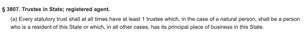 加密货币 ETF 必须选择受托人,以满足特拉华州法案第 3807(a) 条,即「每项法定信托在任何时候均应至少有一名受托人,如为自然人,则受托人应为本国居民,或在所有其他情况下,受托人的主要营业地位于本国」。