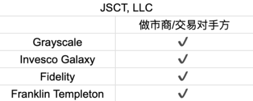 JSCT, LLC 是简街资本(Jane Street Capital, LLC)的母公司,尽管简街资本是 10 个 ETF 的授权交易商,但 JSCT, LLC 还是灰度、景顺 /Galaxy、富达、富兰克林邓普顿这 4 家 ETF 的做市商 / 交易对手方。