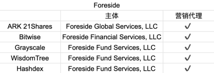 该三个主体为 ARK 21Shares、Bitwise、Grayscale、WisdomTree、Hashdex 这 5 家机构 ETF 提供营销代理服务。