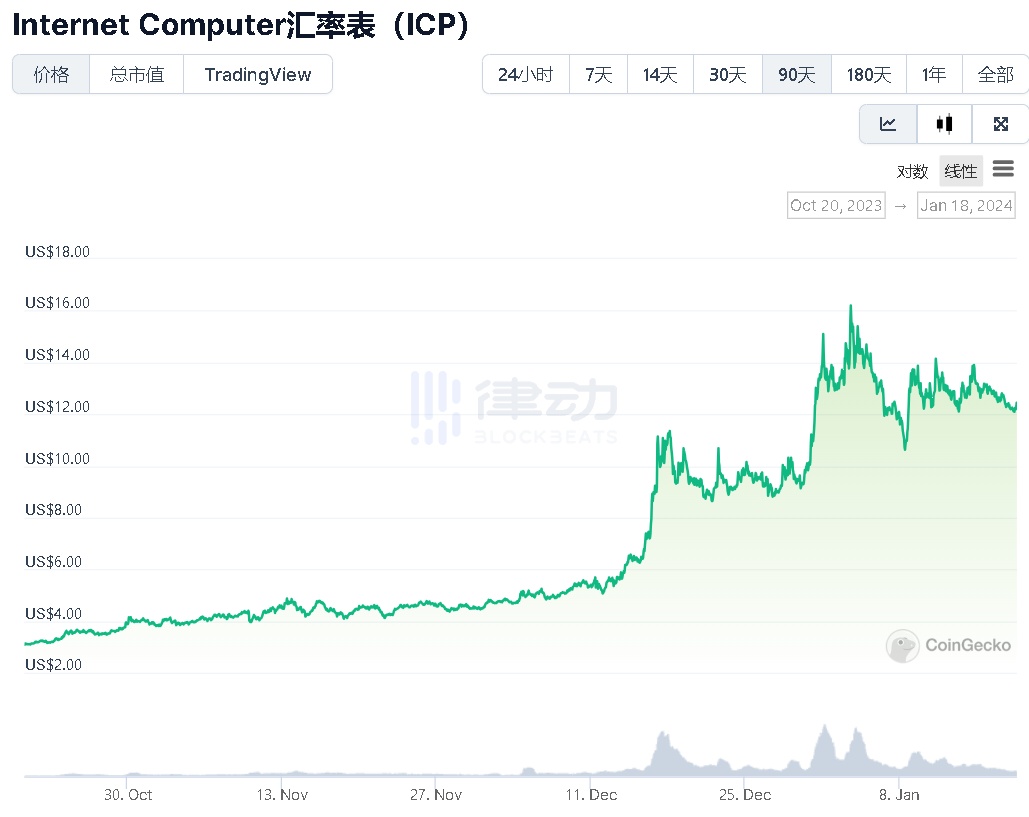 然而这一轮小牛,ICP 的价格从最初的「狗都不买」再次亮眼,累计超过 4 倍的涨幅让无数投资者重获新生。据 coingecko 数据,截至撰稿时,ICP 价格达到 12.4 美元。