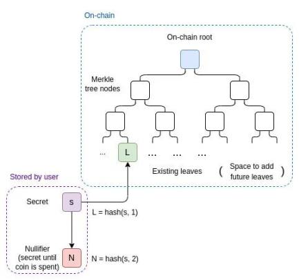 我们是这样解决的。任何拥有币的人都有一个私有秘密「s」。他们在本地计算「leaf」 L=hash (s,1),它被发布在链上,并成为状态的一部分,N=hash (s,2),我们称之为 nullifier。状态存储在默克尔树中。
