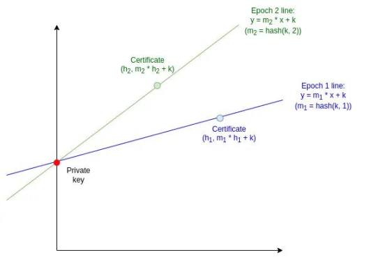 对于每个时期 e,我们取直线 Le (x)=hash (k,e)∗x+k 。直线的斜率为 hash (k,e),y 截距为 k;两者都不为公众所知。要为消息 m 制作一个证书,发送者提供 y=Le (hash (m))= hash (k,e)∗hash (m)+k,以及一个 ZK-SNARK 证明 y 的计算是正确的。
