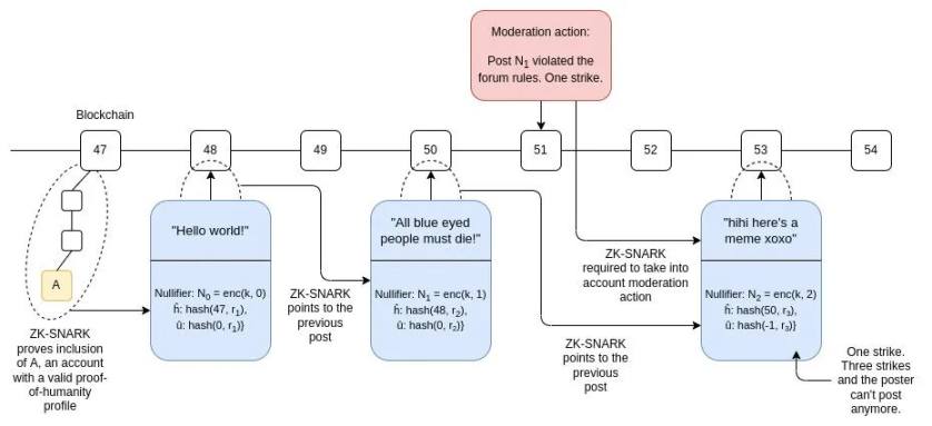假设我们想要建立 0chan,一个像 4chan 一样提供完全匿名的网络论坛 (你甚至没有永久的名字),但是有一个声誉系统来鼓励更多高质量的内容。这可能是一个系统,一些审核 DAO 可以标记违反系统规则的帖子,并建立一个三振出局的机制。