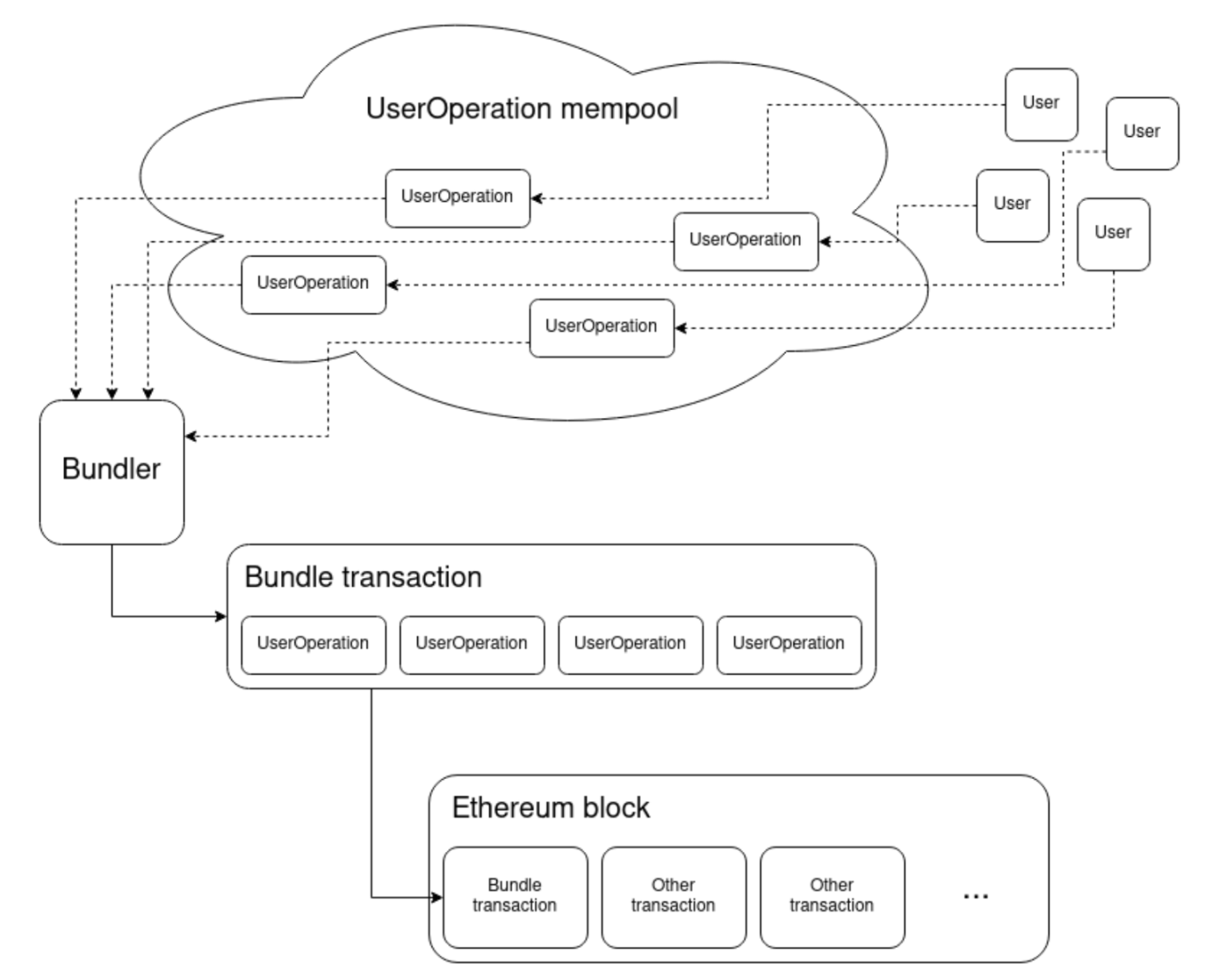 ERC-4337 尝试通过额外的协议手段实现和 EIP-2938 相同的事情。用户需要发送称为用户操作(user operations)的链外消息,这些消息由区块提议者(proposer)或为区块提议者生成 bundles 的构建者(builder)批量收集并打包成单笔交易。提议者或构建者负责过滤操作以确保他们只接受支付费用的操作。用户操作有一个单独的 mempool 存储池,连接到这个存储池的节点会进行 ERC-4337 特定的验证,以确保用户操作在转发之前能够支付费用。