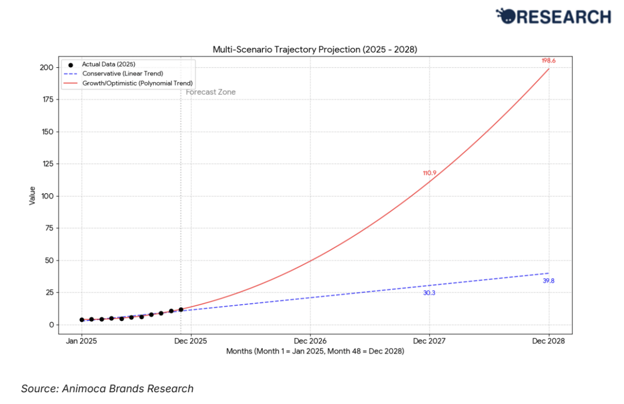 Animoca Brands Research 预测,DEX 与 CEX 永续合约交易量之比将持续攀升。保守线性情景下,该比率预计 2026 年底超过 20%,2028 年达到 40%。