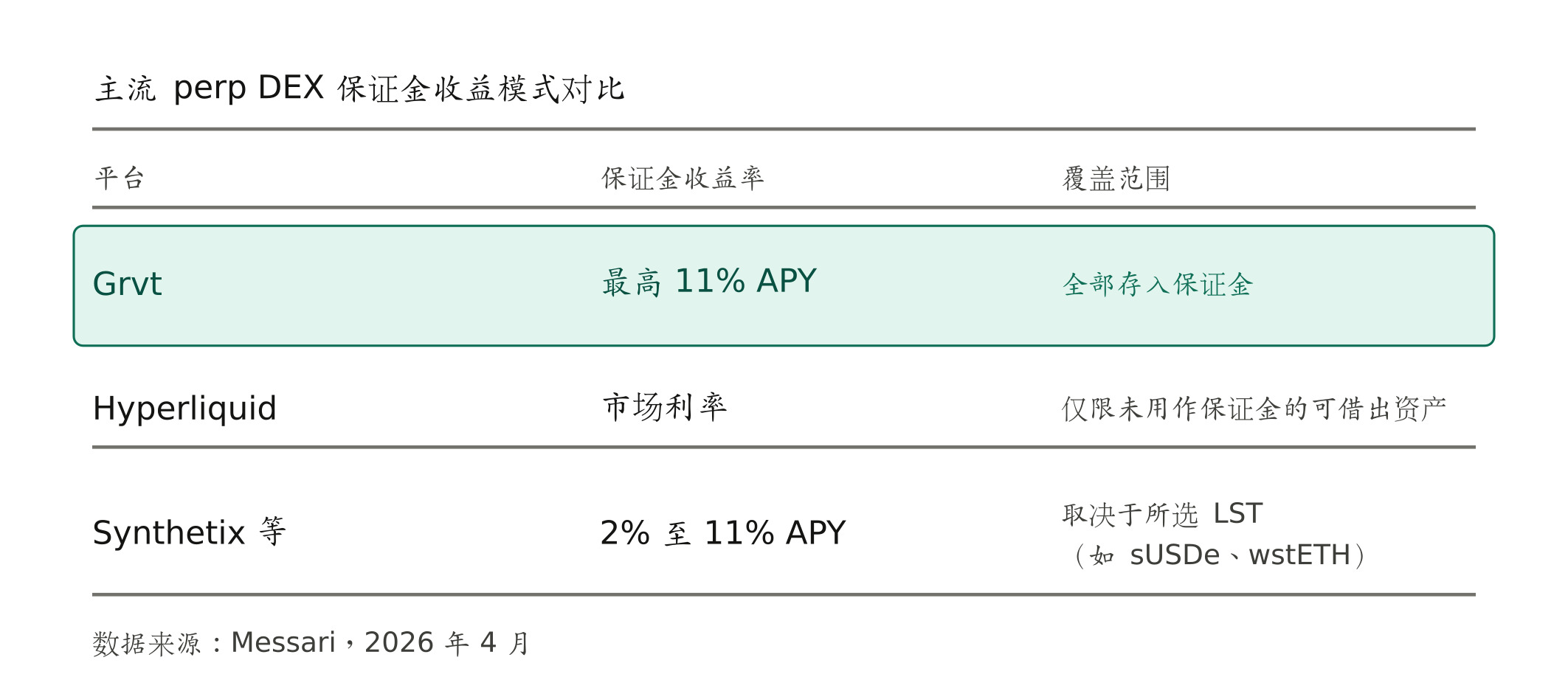 实现这一点的关键在于收益层的架构设计。目前,Grvt 是 perp DEX 中率先实现这一设计的平台。用户存入的资金通过 Yield Layer 在 Ethereum L1 上被路由至 Aave V3 参与生息,而交易活动和账户状态则在独立的私密 L2 上实时追踪。通过将收益来源与交易记录解耦,同一笔资金得以在两个层面同时发挥作用,开仓不中断收益,生息不影响交易。